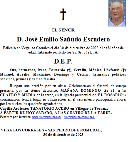 D. José Emilio Sañudo Escudero – Vega los Corrales, San Pedro del Romeral, en 30 diciembre, 2023 por funerariaacebo Comparte esto: Haz clic para compartir en X (Se abre en una ventana nueva) X Haz clic para compartir en Facebook (Se abre en una ventana nueva) Facebook Me gusta Cargando... Relacionado
