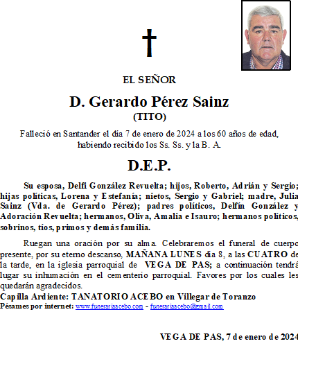 D. Gerardo Pérez Sainz (Tito)- Vega de Pas en 7 enero, 2024 por funerariaacebo Comparte esto: Haz clic para compartir en X (Se abre en una ventana nueva) X Haz clic para compartir en Facebook (Se abre en una ventana nueva) Facebook Me gusta Cargando... Relacionado