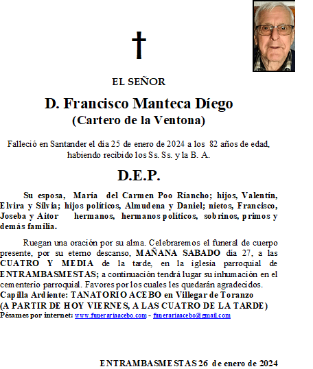 D. Francisco Manteca Diego- Entrambasmestas en 26 enero, 202426 enero, 2024 por funerariaacebo Comparte esto: Haz clic para compartir en X (Se abre en una ventana nueva) X Haz clic para compartir en Facebook (Se abre en una ventana nueva) Facebook Me gusta Cargando... Relacionado