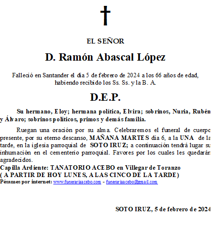 D. Ramón Abascal López- Soto Iruz en 5 febrero, 2024 por funerariaacebo Comparte esto: Compartir en X (Se abre en una ventana nueva) X Comparte en Facebook (Se abre en una ventana nueva) Facebook Me gusta Cargando... Relacionado