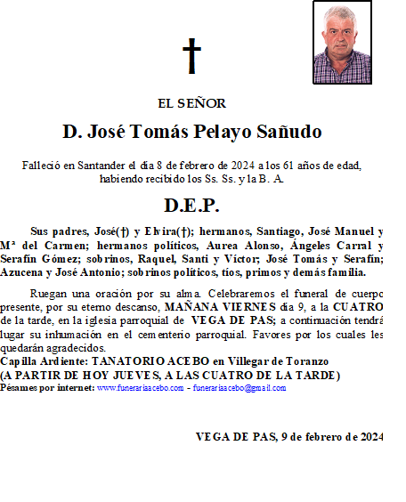 D. José Tomás Pelayo Sañudo- Vega de Pas en 8 febrero, 2024 por funerariaacebo Comparte esto: Haz clic para compartir en X (Se abre en una ventana nueva) X Haz clic para compartir en Facebook (Se abre en una ventana nueva) Facebook Me gusta Cargando... Relacionado