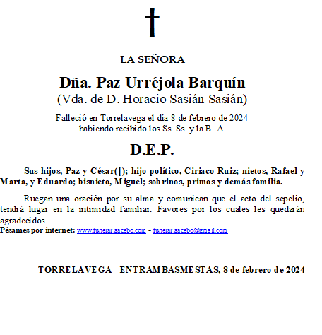 Dña. Paz Urréjola Barquín- Torrelavega- Entrambasmestas en 8 febrero, 2024 por funerariaacebo Comparte esto: Haz clic para compartir en X (Se abre en una ventana nueva) X Haz clic para compartir en Facebook (Se abre en una ventana nueva) Facebook Me gusta Cargando... Relacionado