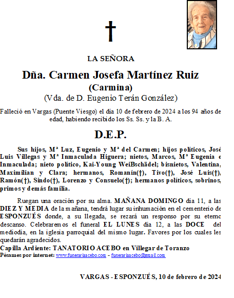 Dña. Carmen Josefa Martínez Ruiz (Carmina)- Vargas – Esponzués en 10 febrero, 2024 por funerariaacebo Comparte esto: Haz clic para compartir en X (Se abre en una ventana nueva) X Haz clic para compartir en Facebook (Se abre en una ventana nueva) Facebook Me gusta Cargando... Relacionado