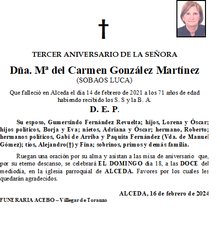 Tercer Aniversario- Dña. Mª del Carmen González Martínez- Alceda en 16 febrero, 2024 por funerariaacebo Comparte esto: Haz clic para compartir en X (Se abre en una ventana nueva) X Haz clic para compartir en Facebook (Se abre en una ventana nueva) Facebook Me gusta Cargando... Relacionado