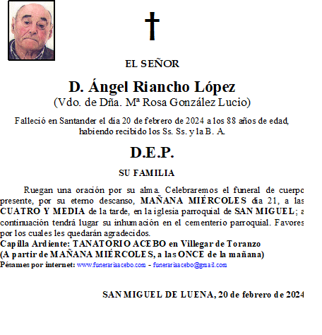 D. Ángel Riancho López- San Miguel de Luena en 20 febrero, 2024 por funerariaacebo Comparte esto: Haz clic para compartir en X (Se abre en una ventana nueva) X Haz clic para compartir en Facebook (Se abre en una ventana nueva) Facebook Me gusta Cargando... Relacionado