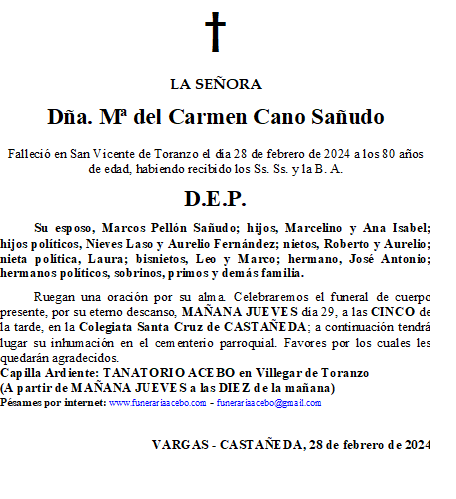 Dña. Mª del Carmen Cano Sañudo- Vargas – Castañeda en 28 febrero, 2024 por funerariaacebo Comparte esto: Haz clic para compartir en X (Se abre en una ventana nueva) X Haz clic para compartir en Facebook (Se abre en una ventana nueva) Facebook Me gusta Cargando... Relacionado