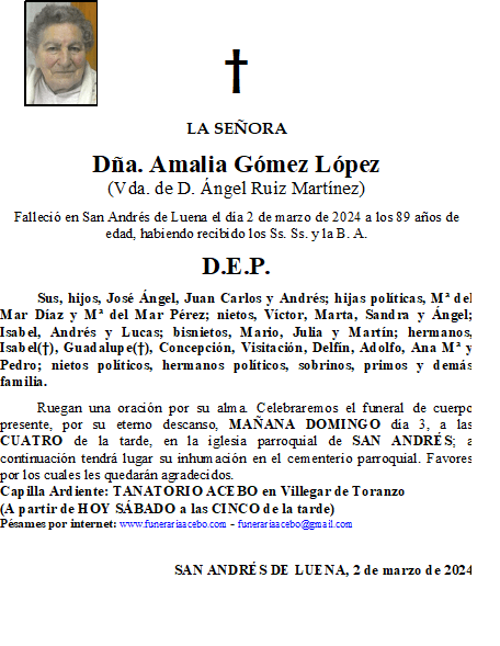 Dña. Amalia Gómez López- San Andrés de Luena en 2 marzo, 2024 por funerariaacebo Comparte esto: Haz clic para compartir en X (Se abre en una ventana nueva) X Haz clic para compartir en Facebook (Se abre en una ventana nueva) Facebook Me gusta Cargando... Relacionado