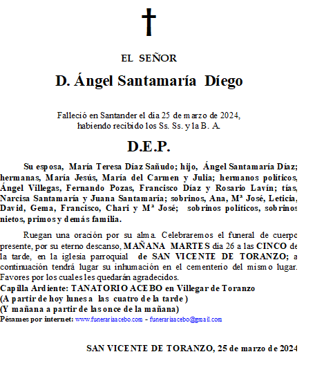 D. Ángel Santamaría Diego- San Vicente de Toranzo en 25 marzo, 2024 por funerariaacebo Comparte esto: Haz clic para compartir en X (Se abre en una ventana nueva) X Haz clic para compartir en Facebook (Se abre en una ventana nueva) Facebook Me gusta Cargando... Relacionado