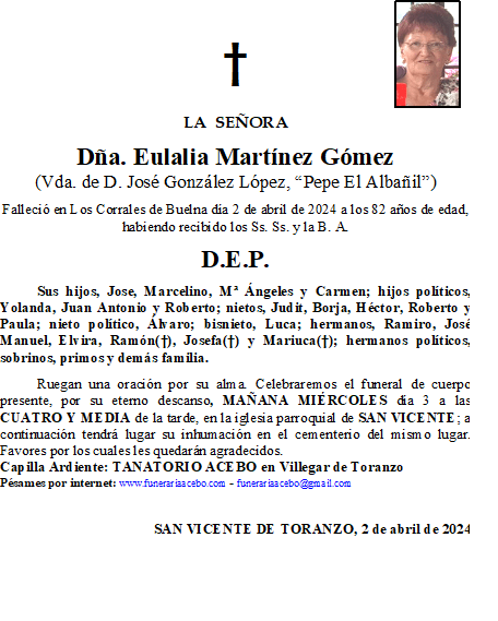Dña. Eulalia Martínez Gómez- San Vicente de Toranzo en 2 abril, 2024 por funerariaacebo Comparte esto: Haz clic para compartir en X (Se abre en una ventana nueva) X Haz clic para compartir en Facebook (Se abre en una ventana nueva) Facebook Me gusta Cargando... Relacionado
