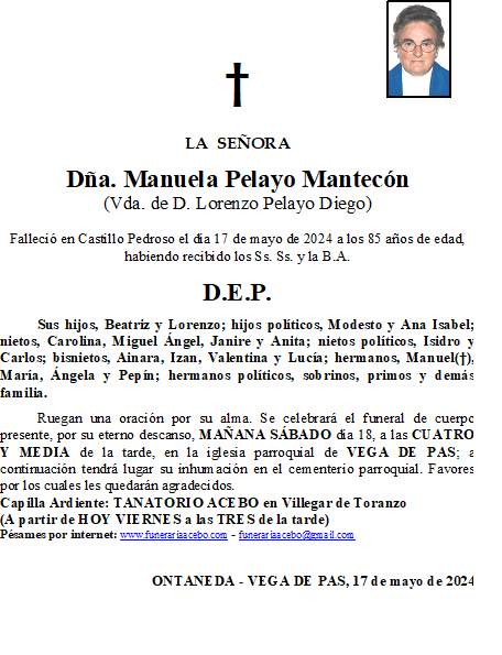 Dña. Manuela Pelayo Mantecón – Ontaneda- Vega de Pas en 17 mayo, 2024 por funerariaacebo Comparte esto: Haz clic para compartir en X (Se abre en una ventana nueva) X Haz clic para compartir en Facebook (Se abre en una ventana nueva) Facebook Me gusta Cargando... Relacionado