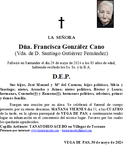 Dña. Francisca González Cano- Vega de Pas en 30 mayo, 2024 por funerariaacebo Comparte esto: Haz clic para compartir en X (Se abre en una ventana nueva) X Haz clic para compartir en Facebook (Se abre en una ventana nueva) Facebook Me gusta Cargando... Relacionado