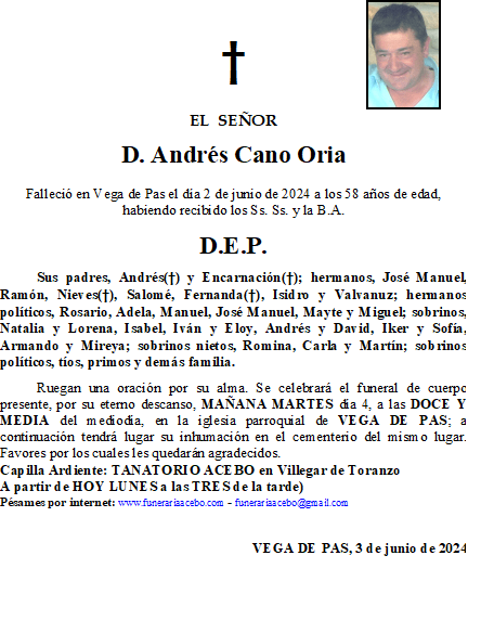 D. Andrés Cano Oria- Vega de Pas en 3 junio, 2024 por funerariaacebo Comparte esto: Haz clic para compartir en X (Se abre en una ventana nueva) X Haz clic para compartir en Facebook (Se abre en una ventana nueva) Facebook Me gusta Cargando... Relacionado