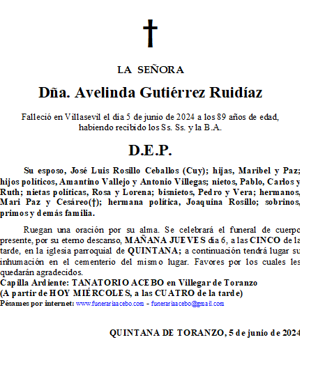 Dña. Avelinda Gutiérrez Ruidíaz- Quintana de Toranzo en 5 junio, 2024 por funerariaacebo Comparte esto: Haz clic para compartir en X (Se abre en una ventana nueva) X Haz clic para compartir en Facebook (Se abre en una ventana nueva) Facebook Me gusta Cargando... Relacionado