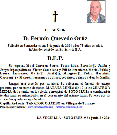 D. Fermín Quevedo Ortiz- La Veguilla- Soto Iruz en 9 junio, 2024 por funerariaacebo Comparte esto: Haz clic para compartir en X (Se abre en una ventana nueva) X Haz clic para compartir en Facebook (Se abre en una ventana nueva) Facebook Me gusta Cargando... Relacionado