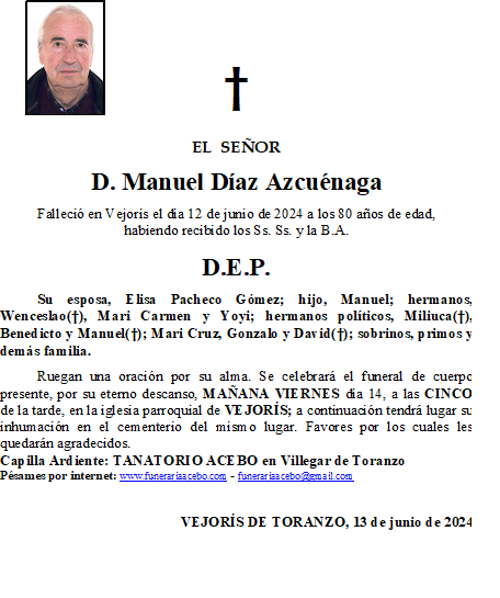 D. Manuel Díaz Azcuénaga- Vejorís en 13 junio, 2024 por funerariaacebo Comparte esto: Haz clic para compartir en X (Se abre en una ventana nueva) X Haz clic para compartir en Facebook (Se abre en una ventana nueva) Facebook Me gusta Cargando... Relacionado