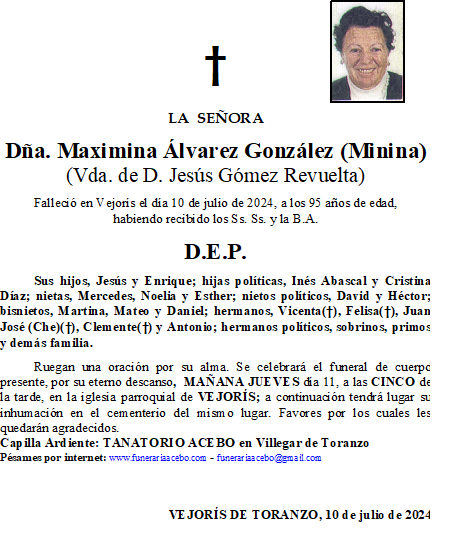 Dña. Maximina Álvarez González (Minina)- Vejorís en 10 julio, 2024 por funerariaacebo Comparte esto: Haz clic para compartir en X (Se abre en una ventana nueva) X Haz clic para compartir en Facebook (Se abre en una ventana nueva) Facebook Me gusta Cargando... Relacionado