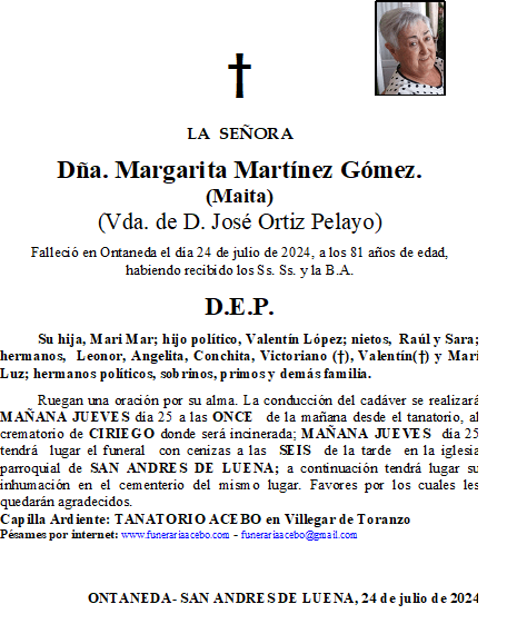 Dña. Margarita Martínez Gómez. Ontaneda – san Andres de Luena. en 24 julio, 2024 por funerariaacebo Comparte esto: Haz clic para compartir en X (Se abre en una ventana nueva) X Haz clic para compartir en Facebook (Se abre en una ventana nueva) Facebook Me gusta Cargando... Relacionado
