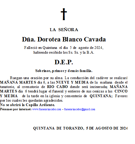 Dña. Dorotea Blanco Cavada- Quintana de Toranzo en 5 agosto, 2024 por funerariaacebo Comparte esto: Haz clic para compartir en X (Se abre en una ventana nueva) X Haz clic para compartir en Facebook (Se abre en una ventana nueva) Facebook Me gusta Cargando... Relacionado