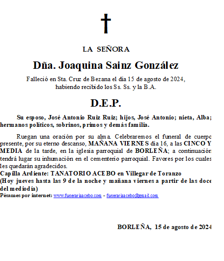 Dña. Joaquina Sainz González- Borleña en 15 agosto, 2024 por funerariaacebo Comparte esto: Haz clic para compartir en X (Se abre en una ventana nueva) X Haz clic para compartir en Facebook (Se abre en una ventana nueva) Facebook Me gusta Cargando... Relacionado