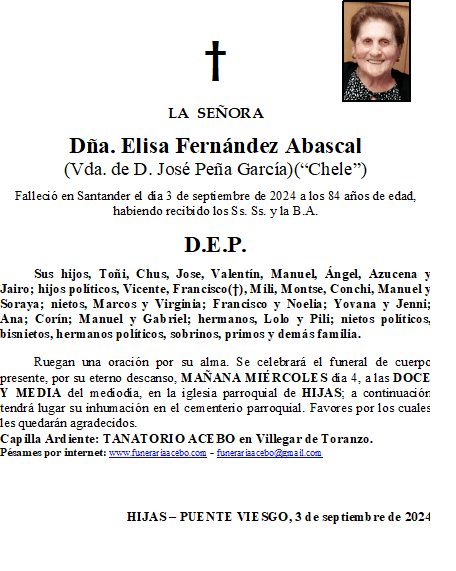Dña. Elisa Fernández Abascal- Hijas en 3 septiembre, 2024 por funerariaacebo Comparte esto: Haz clic para compartir en X (Se abre en una ventana nueva) X Haz clic para compartir en Facebook (Se abre en una ventana nueva) Facebook Me gusta Cargando... Relacionado