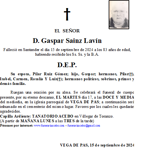 D. Gaspar Sainz Lavín- Vega de Pas en 15 septiembre, 2024 por funerariaacebo Comparte esto: Haz clic para compartir en X (Se abre en una ventana nueva) X Haz clic para compartir en Facebook (Se abre en una ventana nueva) Facebook Me gusta Cargando... Relacionado