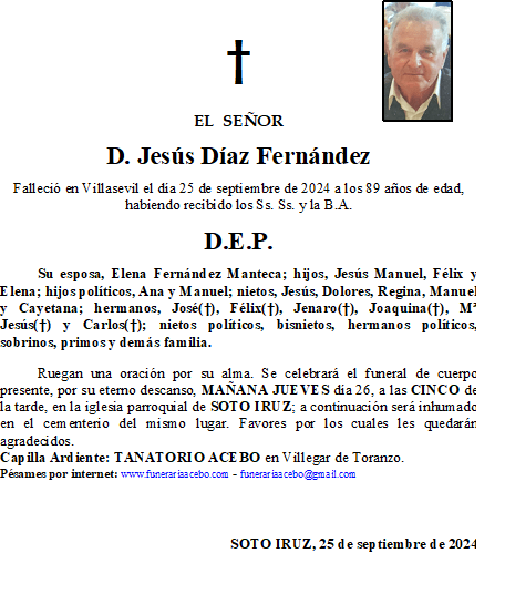 D. Jesús Díaz Fernández- Soto Iruz en 25 septiembre, 2024 por funerariaacebo Comparte esto: Haz clic para compartir en X (Se abre en una ventana nueva) X Haz clic para compartir en Facebook (Se abre en una ventana nueva) Facebook Me gusta Cargando... Relacionado