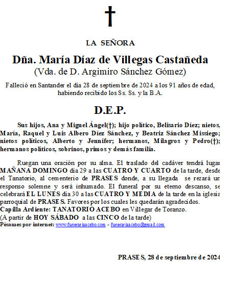 Dña. María Díaz de Villegas Castañeda- Prases en 28 septiembre, 2024 por funerariaacebo Comparte esto: Haz clic para compartir en X (Se abre en una ventana nueva) X Haz clic para compartir en Facebook (Se abre en una ventana nueva) Facebook Me gusta Cargando... Relacionado