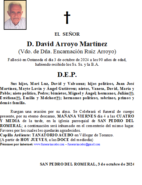 D. David Arroyo Martínez – San Pedro del Romeral en 3 octubre, 2024 por funerariaacebo Comparte esto: Haz clic para compartir en X (Se abre en una ventana nueva) X Haz clic para compartir en Facebook (Se abre en una ventana nueva) Facebook Me gusta Cargando... Relacionado