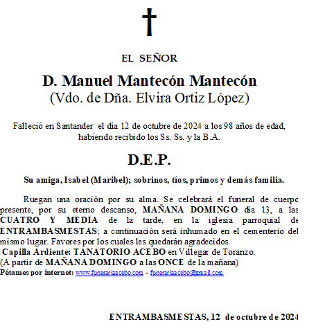 D. Manuel Mantecón Mantecón – Entrambasmestas. en 12 octubre, 2024 por funerariaacebo Comparte esto: Haz clic para compartir en X (Se abre en una ventana nueva) X Haz clic para compartir en Facebook (Se abre en una ventana nueva) Facebook Me gusta Cargando... Relacionado
