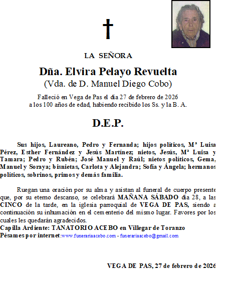 Dña. Elvira Pelayo Revuelta- Vega de Pas en 27 febrero, 2026 por funerariaacebo Comparte esto: Compartir en X (Se abre en una ventana nueva) X Comparte en Facebook (Se abre en una ventana nueva) Facebook Me gusta Cargando... Relacionado