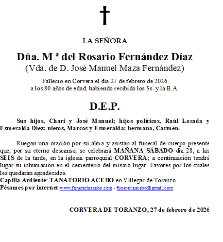 Dña. Mª del Rosario Fernández Díaz- Corvera de Toranzo en 27 febrero, 2026 por funerariaacebo Comparte esto: Compartir en X (Se abre en una ventana nueva) X Comparte en Facebook (Se abre en una ventana nueva) Facebook Me gusta Cargando... Relacionado