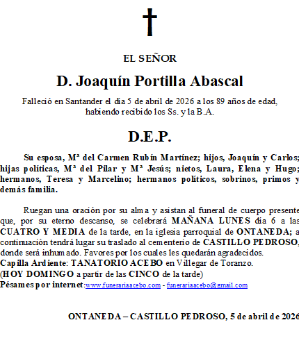 D. Joaquín Portilla Abascal- Ontaneda- Castillo Pedroso en 5 abril, 2026 por funerariaacebo Comparte esto: Compartir en X (Se abre en una ventana nueva) X Comparte en Facebook (Se abre en una ventana nueva) Facebook Me gusta Cargando... Relacionado