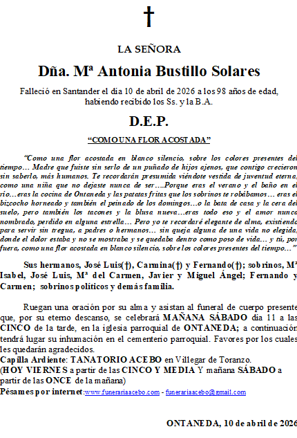 Dña. Mª Antonia Bustillo Solares- Ontaneda en 10 abril, 2026 por funerariaacebo Comparte esto: Compartir en X (Se abre en una ventana nueva) X Comparte en Facebook (Se abre en una ventana nueva) Facebook Me gusta Cargando... Relacionado