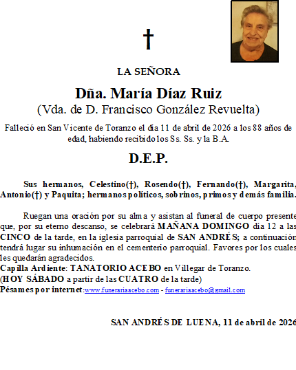 Dña. María Díaz Ruiz- San Andrés de Luena en 11 abril, 2026 por funerariaacebo Comparte esto: Compartir en X (Se abre en una ventana nueva) X Comparte en Facebook (Se abre en una ventana nueva) Facebook Me gusta Cargando... Relacionado