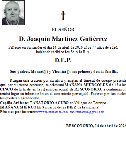 D. Joaquín Martínez Gutiérrez- Resconorio en 14 abril, 2026 por funerariaacebo Comparte esto: Compartir en X (Se abre en una ventana nueva) X Comparte en Facebook (Se abre en una ventana nueva) Facebook Me gusta Cargando... Relacionado