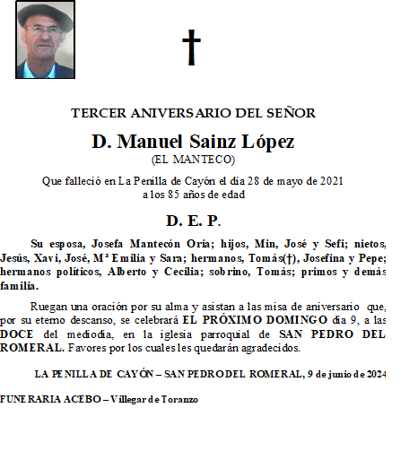 Tercer Aniversario- D. Manuel Sainz López (El Manteco) – San Pedro del Romeral en 6 junio, 20246 junio, 2024 por funerariaaceboDeja un comentario