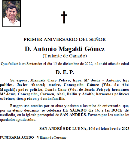 Primer Aniversario- D. Antonio Magaldi Gómez- San Andrés de Luena en 12 diciembre, 2023 por funerariaaceboDeja un comentario