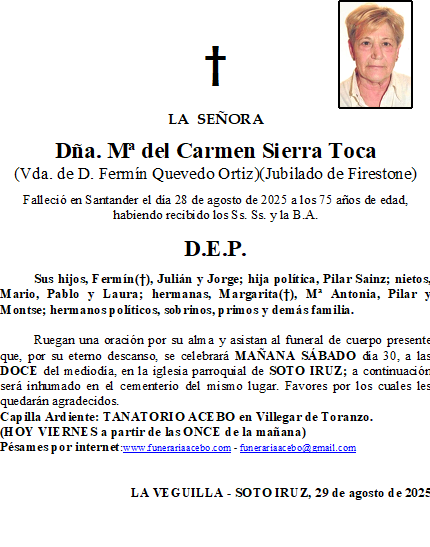 Dña. Mª del Carmen Sierra Toca – La Veguilla-Soto Iruz en 29 agosto, 2025 por funerariaaceboDeja un comentario