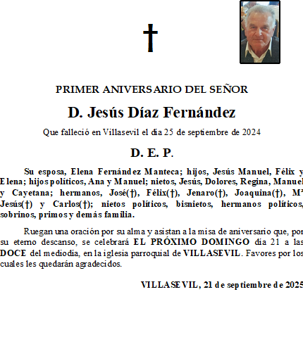 1º Aniversario. D. Jesús Díaz Fernández – Villasevil en 18 septiembre, 202519 septiembre, 2025 por funerariaaceboDeja un comentario