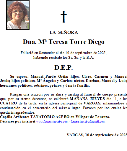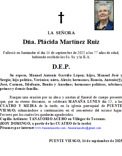Dña. Plácida Martínez Ruiz – Puente Viesgo en 14 septiembre, 2025 por funerariaaceboDeja un comentario