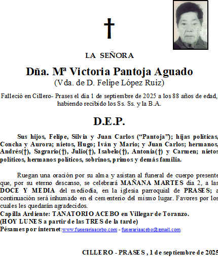 Dña. Mª Victoria Pantoja Aguado – Cillero-Prases en 1 septiembre, 2025 por funerariaaceboDeja un comentario