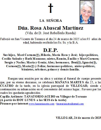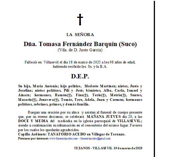 Dña. Tomasa Fernandez Barquín. (Suco) Tezanos- Villasevil. en 19 marzo, 2025 por funerariaaceboDeja un comentario